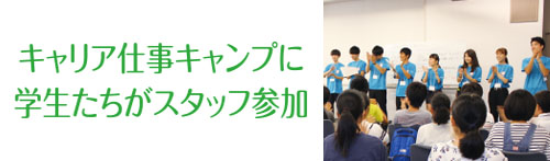 8月1日〜5日の「キャリア教育しごと体験キャンプ」(千葉県教委主催)に、学生8名がスタッフとして参加。県内中高生約40名の就業体験やプレゼン力を伸ばすため、活躍してくれました。