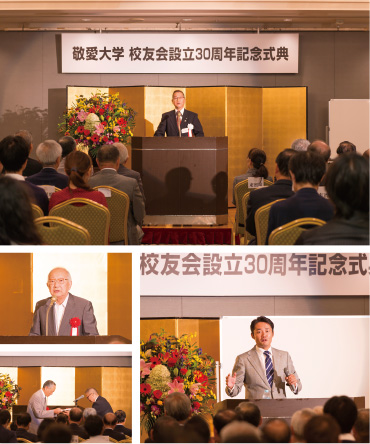 平成28年9月17日(土)、三井ガーデンホテル千葉にて敬愛大学校友会30周年記念祝賀会が盛大に開催されました。 当校友会は1986(昭和61)年11月30日に設立。会員の皆様方のご協力とご支援のおかげで、列席者は関係者を含め総勢250名にのぼりました。ゲストにお招きした元国会議員、杉村太蔵氏の特別講演等もあり祝賀会は大盛況。 設立当初からの歴史を振り返りながら旧友との懐かしい会話に花が咲き、改めて校友会の必要性を再確認した貴重な一日となりました。