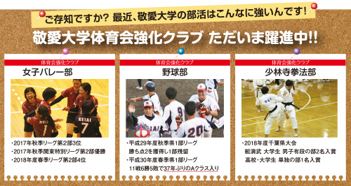 近年、敬愛大学では体育会強化クラブや育成クラブ制を設け、体育会クラブの強化に取り組んできました。その結果が出はじめ、女子バレー部、野球部、少林寺拳法部、硬式テニス部などが各種大会で見事な成績を残しています。ところが、残念ながら他大学に比べ、試合の応援に行く人が少ないのが現状です。他大学では多数のOB・OGが応援に駆けつけ、声援を送り、ときには差し入れをしたり、檄を飛ばしたりする様子を見掛けます。
