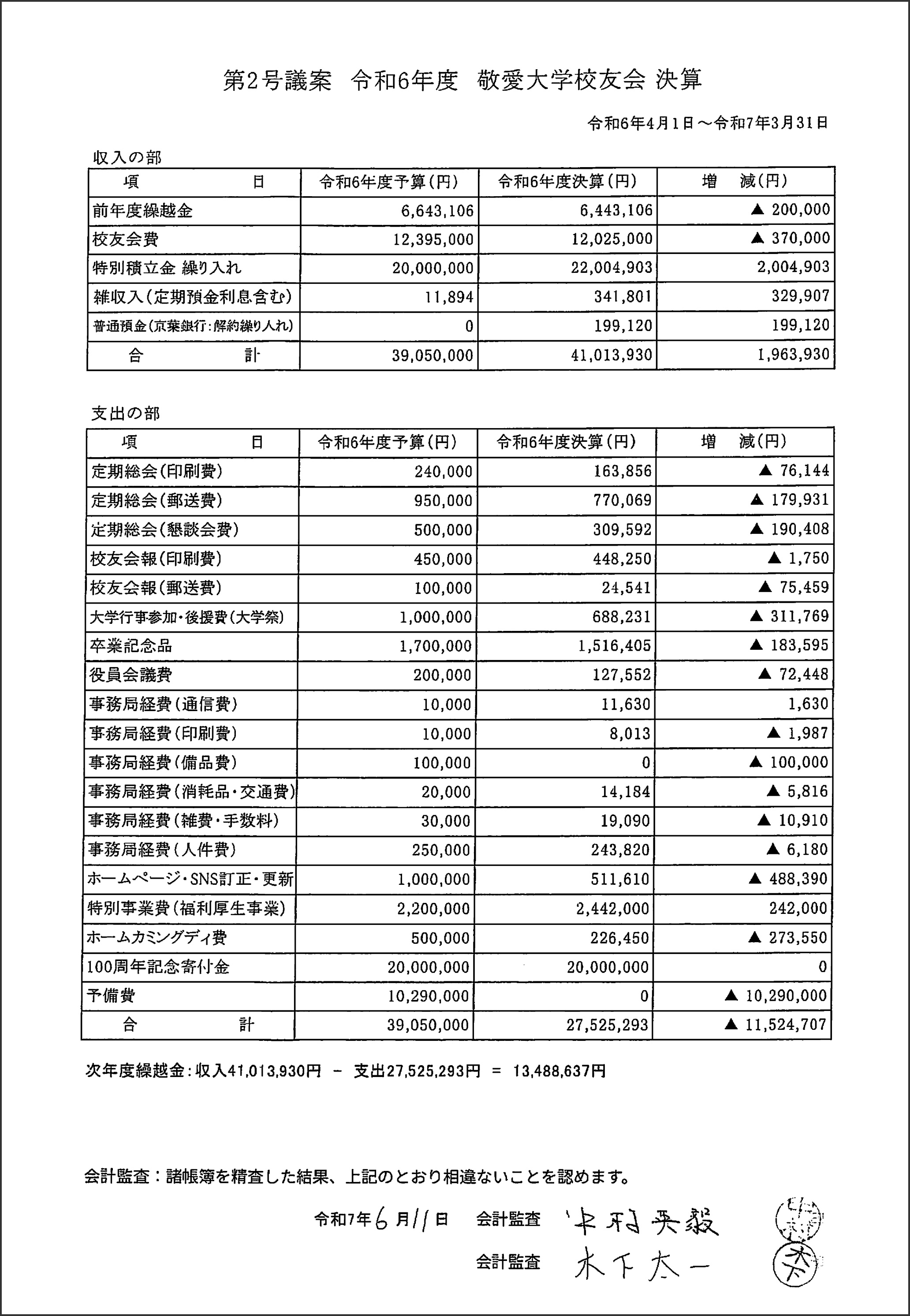 | 第二号議案 | 「令和6年度決算報告・監査報告」について決算報告は佐久間氏が報告。会計監査中村氏より監査報告がなされた後、一括審議され満場一致で承認されました。 |